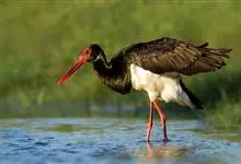 黑鹳是鹳形目鹳科鹳属鸟类,俗称乌鹳、钢鹳、老鹤。黑鹳头、颈和脊均呈黑褐色,故名黑鹳。黑鹳上体羽黑色、并带有绿紫色金属光泽,胸腹部羽白色;嘴、腿均红色;两性相似;成鸟嘴长而直,基部较粗,…全部>>