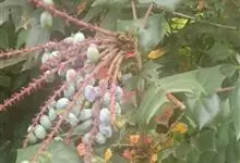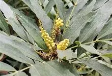 十大功劳 Fedde),小檗科十大功劳属常绿灌木植物。叶子较大且较多,呈椭圆形,绿色,表面光滑无毛,叶柄较长;花朵较小,呈多边形,黄色,花瓣对称分布,表面有绒毛;果实呈圆形,褐色,…全部>>