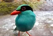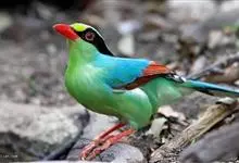 蓝绿鹊:中型鸟类,共有5个亚种。体长36-38厘米。尾长,嘴、脚红色。通体羽色主要为草绿色,宽阔的黑色贯眼纹向后延伸到后颈,在绿色的头侧极为醒目。两翅栗红色,内侧飞羽具黑色次端斑和白色尖端。尾绿色,…全部>>