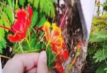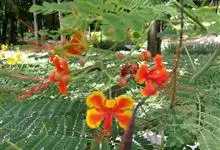 洋金凤 Sw.),豆科小凤花属灌木状或小乔木植物,枝无毛,绿或粉绿色;二回羽状复叶;总状花序伞房状,萼片无毛,花瓣橙红或黄色,圆形,花丝红色,子房无毛,花柱橙黄色;荚果窄而薄,…全部>>