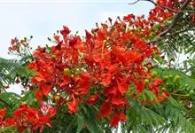凤凰木 Raf.) ,别名火树、红花楹、凤凰花、火凤凰、金凤花、红楹,是豆科凤凰木属高大落叶乔木,树皮灰褐色,粗糙。二回偶数羽状复叶互生,矩圆形,两面均被柔毛。伞房式总状花序,花大,花瓣5枚,圆形,…全部>>