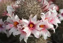 白雪光为南国玉属多年生肉质植物。茎球形或稍扁圆形,高约10厘米左右,单生,直径为6至10厘米,有小疣状突起,呈螺旋状排列,球体密生3至5毫米的放射形白刺,中心刺淡黄色。花顶生,漏斗状,绯红色,花从白…全部>>