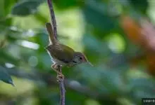 普通缝叶莺,是雀形目鹅科莺亚科缝叶莺属一种。体长10-14厘米,体重7-10克,雄鸟前额棕红,头顶至枕棕橄榄褐,上体橄榄绿染黄,飞羽及尾羽暗褐;繁殖期雄鸟的中央尾羽特形延长,下体淡皮黄白色。…全部>>