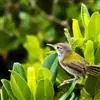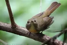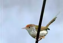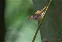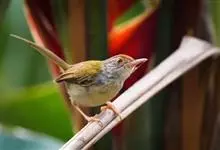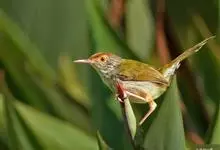 普通缝叶莺,是雀形目鹅科莺亚科缝叶莺属一种。体长10-14厘米,体重7-10克,雄鸟前额棕红,头顶至枕棕橄榄褐,上体橄榄绿染黄,飞羽及尾羽暗褐;繁殖期雄鸟的中央尾羽特形延长,下体淡皮黄白色。…全部>>