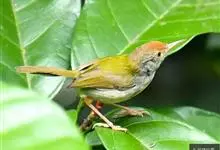 普通缝叶莺,是雀形目鹅科莺亚科缝叶莺属一种。体长10-14厘米,体重7-10克,雄鸟前额棕红,头顶至枕棕橄榄褐,上体橄榄绿染黄,飞羽及尾羽暗褐;繁殖期雄鸟的中央尾羽特形延长,下体淡皮黄白色。…全部>>