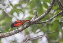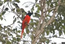 灰喉山椒鸟:共有8个亚种。体长18-22厘米。雄鸟头部和背亮黑色,腰、尾上覆羽和下体朱红色,翅黑色具一大一小的两道朱红色翼斑。中央尾羽黑色,外侧尾羽基部黑色,端部红色。…全部>>
