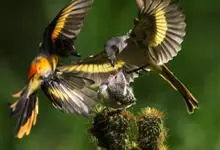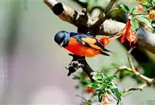 灰喉山椒鸟:共有8个亚种。体长18-22厘米。雄鸟头部和背亮黑色,腰、尾上覆羽和下体朱红色,翅黑色具一大一小的两道朱红色翼斑。中央尾羽黑色,外侧尾羽基部黑色,端部红色。…全部>>