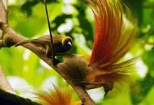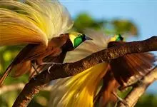 大极乐鸟是极乐鸟属中最大的鸟种。成年雄鸟体长可达到43厘米,雌性可达35厘米。雄鸟的额、颊、喉等墨绿色;头、颈黄色;上体暗赤栗色;腹部葡萄红色,胁部有长饰羽,其基部橙黄,中部黄色,…全部>>