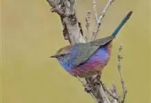 凤头雀莺:小型鸟类。体长9-10厘米,雄鸟呈毛茸茸的紫色和绛紫色,顶冠淡紫灰色,额及凤头白色,尾全蓝。雌鸟喉及上胸白,至臀部渐变成淡紫色,耳羽灰,…全部>>