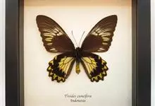 金裳凤蝶是凤蝶科、裳凤蝶属的动物。金裳凤蝶身体呈黑色,头、颈和胸侧有红毛,腹部有黑黄两色相间条纹,雄蝶前翅黑色,具黑天鹅绒光泽,各脉两侧灰白色,后翅金黄色,各室外缘有等腰三角形黑斑1枚,斑内侧有晕,…全部>>