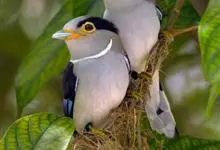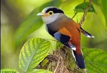 银胸丝冠鸟是雀形目阔嘴鸟科的鸟类,在全世界共分化为10个亚种。体长16-18厘米。嘴宽阔、天蓝色,基部橙色。鼻孔圆形具宽阔的黑色眉纹。上背烟灰色,下背至尾上覆羽栗色,两翅的翼缘白色,翼角羽缘缀浅灰蓝色,…全部>>