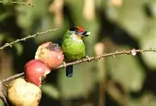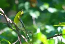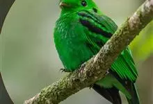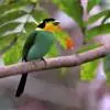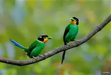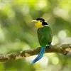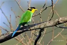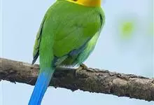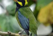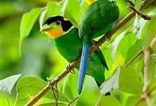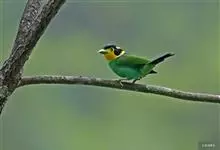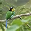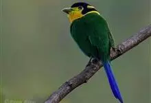 长尾阔嘴鸟是雀形目阔嘴鸟科的鸟类,体长约25厘米,是绿色阔嘴鸟。形长的楔形尾蓝色,喉及脸黄色,顶冠及颈背黑色。两翼黑并具显著的蓝色斑块。头顶具蓝色小点斑,眼后有一黄色点斑。亚成鸟多为绿色。结群活动于…全部>>
