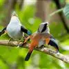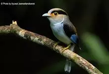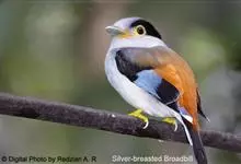 银胸丝冠鸟是雀形目阔嘴鸟科的鸟类,在全世界共分化为10个亚种。体长16-18厘米。嘴宽阔、天蓝色,基部橙色。鼻孔圆形具宽阔的黑色眉纹。上背烟灰色,下背至尾上覆羽栗色,两翅的翼缘白色,翼角羽缘缀浅灰蓝色,…全部>>