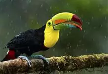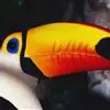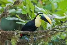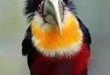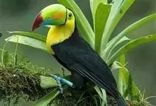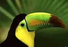 鵎鵼:又名巨嘴鸟。体长约67厘米,嘴巨大,长17~24厘米,宽5~9厘米,形似嘴刀。嘴非常漂亮,上半部黄色,略呈淡绿色,下半部呈蔚蓝色,喙尖点缀着一点殷红。眼睛四周镶嵌着天蓝色羽毛眼圈,胸脯橙黄色,…全部>>