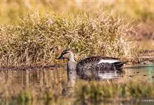 绿翅鸭是小型鸭类,体长37厘米,体重约0.5千克。嘴脚均为黑色。雄鸟头至颈部深栗色,头顶两侧从眼开始有一条宽阔的绿色带斑一直延伸至颈侧,尾下覆羽黑色,两侧各有一黄色三角形斑,在水中游泳时,极为醒目。…全部>>