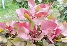 紫锦木是大戟科、大戟属的常绿乔木。叶圆卵形,主脉于两面明显,侧脉数对,边缘全缘,两面红色;花序生于二歧分枝的顶端,总苞阔钟状,裂片呈三角形,边缘具毛,腺体深绿色呈半圆形,…全部>>