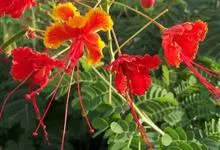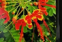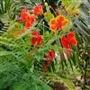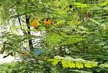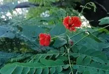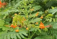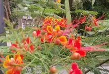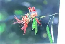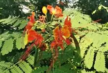 洋金凤 Sw.),豆科小凤花属灌木状或小乔木植物,枝无毛,绿或粉绿色;二回羽状复叶;总状花序伞房状,萼片无毛,花瓣橙红或黄色,圆形,花丝红色,子房无毛,花柱橙黄色;荚果窄而薄,…全部>>