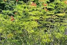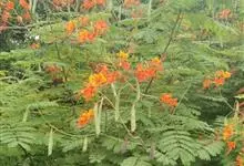 洋金凤 Sw.),豆科小凤花属灌木状或小乔木植物,枝无毛,绿或粉绿色;二回羽状复叶;总状花序伞房状,萼片无毛,花瓣橙红或黄色,圆形,花丝红色,子房无毛,花柱橙黄色;荚果窄而薄,…全部>>