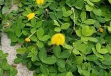 蔓花生,豆科落花生属植物,多年生宿根草本。枝条呈蔓性,株高10-15厘米。叶互生,倒卵形,全缘。花腋生,蝶形,金黄色,花色鲜艳,花量多,白天开花,晚上闭合,花期3~11月。荚果长桃形,果壳薄。…全部>>