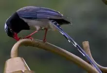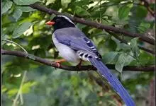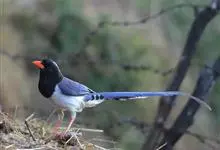 红嘴蓝鹊,别名山鹊、长尾鹊,是鸦科蓝鹊属的一种观赏性较强的大型鸣禽。该物种为体长54~65cm,头、颈、喉和胸黑色,头顶至后颈有一块白色至淡蓝白色或紫灰色块斑,其余上体紫蓝灰色或淡蓝灰褐色。尾长呈凸状,…全部>>