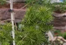 蓬莱松是天门冬科、天门冬属多年生丛生草本植物。宿存,圆柱形肉质根,纵截面为绿色和表面灰色。植株高可达3米。茎呈圆柱形或近四边形,底部木质化,具有灰色或灰褐色。幼嫩的茎在每个节上都被紫绿色鳞片包,…全部>>