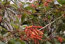 郎德木是茜草科,郎德木属灌木,高可达2米;叶对生,革质,叶片卵形、椭圆形或长圆形,边缘背卷,叶两面常皱,托叶三角形,有柔毛,聚伞花序顶生,有花数朵至多朵,花有花梗;萼管近球形,裂片线形,花冠鲜红色,…全部>>