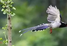 红嘴蓝鹊,别名山鹊、长尾鹊,是鸦科蓝鹊属的一种观赏性较强的大型鸣禽。该物种为体长54~65cm,头、颈、喉和胸黑色,头顶至后颈有一块白色至淡蓝白色或紫灰色块斑,其余上体紫蓝灰色或淡蓝灰褐色。尾长呈凸状,…全部>>