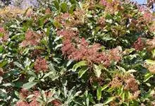 石楠 Kalkman),是蔷薇科石楠属的常绿乔木,高5~12米,株型紧凑,树冠圆球形。树枝为褐灰色;鳞片为褐色,没有毛;叶片革质,长椭圆至侧卵状椭圆形,有锯齿,新叶红色光亮。复伞房花序,白色小花,…全部>>