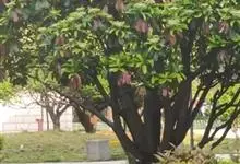 石楠 Kalkman),是蔷薇科石楠属的常绿乔木,高5~12米,株型紧凑,树冠圆球形。树枝为褐灰色;鳞片为褐色,没有毛;叶片革质,长椭圆至侧卵状椭圆形,有锯齿,新叶红色光亮。复伞房花序,白色小花,…全部>>