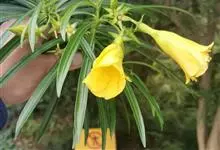 黄花夹竹桃K. Schum.),又名“酒杯花”“柳木子”“黄花状元竹”,是夹竹桃科,黄花夹竹桃属下的常绿乔木植物。高达5m,全株无毛,树皮棕褐色;叶互生,近革质,线形或线状披针形;花大,黄色,具香味,…全部>>
