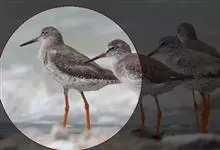 红脚鹬:体长28厘米,上体褐灰,下体白色,胸具褐色纵纹。飞行时腰部白色明显,次级飞羽具明显白色外缘。尾上具黑白色细斑。虹膜黑褐色,嘴长直而尖,基部橙红色,尖端黑褐色。脚较细长,亮橙红色,…全部>>