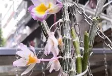 玫瑰石斛是兰科石斛属的多年生附生草本植物。茎斜下或下垂,青绿色,圆柱形,节间鞘具绿或白色相间的条纹;叶窄披针形;花序短,生于已落叶的老茎上部,花序梗长,萼片和花瓣白色,上部带淡紫色,干后蜡质状,…全部>>