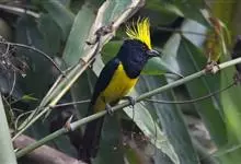 冕雀:共有4个亚种。体长20-21厘米,体重34-49克。具蓬松的黄色长型冠羽。雌鸟似雄鸟,但喉及胸深橄榄黄色,上体沾橄榄色。不会被误认的体大的黄色及黑色山雀。混群栖于原始林及次生林的林冠层,…全部>>