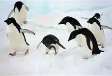 阿德利企鹅在企鹅家族中属中、小型种类,体长72-76厘米,和许多种类企鹅一样,雌鸟和雄鸟同形同色,从外形难以辨认。眼圈为白色,头部呈蓝绿色,嘴为黑色,嘴角有细长羽毛。羽毛由黑、白两色组成,…全部>>