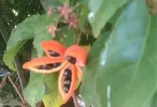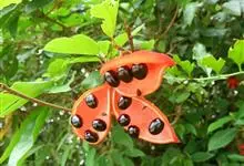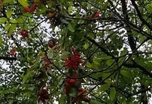 假苹婆是锦葵科苹婆属乔木植物。幼枝被毛;叶椭圆形或披针形,先端骤尖,基部钝或近圆无毛;圆锥花序腋生,花淡红色;蓇葖果鲜红色,长卵圆形或长椭圆形;种子卵圆形黑褐色;花期4-6月。…全部>>