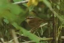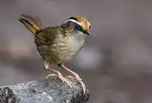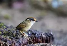 黄喉雀鹛是雀眉科、拟希鹛属小型鸟类,体长11-12厘米。头顶浅黄色具黑色鳞状斑,头顶两侧各有一道黑色侧冠纹,眉纹浅黄色、长而宽阔。上体灰绿色,两翅和尾褐色而具浅黄色窄缘。下体淡黄色。特征明显,…全部>>