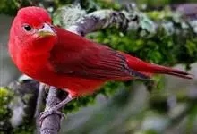 血雀雀科朱雀属鸟类,体重36-49克;体长155-182毫米。雄鸟除眼先、翼与尾为黑色外,通体为鲜红色;嘴鲜黄;雌鸟暗橄榄绿色,羽端较淡或带黄色;腰鲜黄;嘴较暗。虹膜褐色;嘴黄色;腿和脚褐色。…全部>>