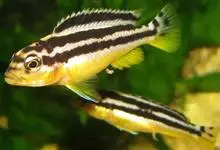 非洲凤凰是最早从马拉维湖出口的慈鲷之一。体长约15厘米,捕食性鱼类。幼鱼为鲜黄色,身体上半部分两条黑色条纹从吻延伸到尾鳍。 背鳍上也有一条黑色条纹。成年以后的雌鱼依然保持着这种体色,…全部>>