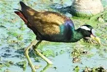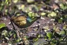 铜翅水雉雉鸻科铜翅水雉属的一种物种,是小型涉禽,体长28-31厘米。头颈、下体黑色,具金属色辉。从眼到颈有白色纵纹,背、内侧初级一飞羽橄榄铜绿色,尾下覆羽栗色。跗蹠的前后均有盾状鳞,趾、爪均甚长,…全部>>