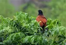 褐翅鸦鹃,是鹃形目鸦鹃科鸦鹃属的鸟类。褐翅鸦鹃的身体为黑色;头颈和胸带蓝紫色金属光泽并具黑亮的羽干纹,下胸至腹部泛金属绿光泽;两翼和肩部为棕栗色,外侧飞羽具暗色羽端,尾羽闪铜绿色光泽;虹膜赤红色,…全部>>