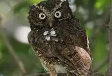 小雕鸮是脊索动物门鸟纲今颚总目、鸮形目雕鸮属动物。面盘显著,为淡棕黄色,杂以褐色的细斑。眼先密被白色的刚毛状羽,各羽均具黑色端斑。眼的上方有一个大形黑斑。皱领为黑褐色。头顶为黑褐色,羽缘为棕白色,…全部>>