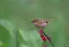 极北柳莺:体长11-13厘米,体小偏灰橄榄色,具明显的黄白色长眉纹,眼先及过眼纹近黑。上体概呈灰橄榄绿色;具甚浅的白色翼斑,大覆羽先端黄白色,形成一道翅上翼斑;中覆羽羽尖成第二道模糊的翼斑;下体白色…全部>>