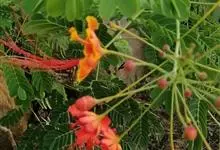 洋金凤 Sw.),豆科小凤花属灌木状或小乔木植物,枝无毛,绿或粉绿色;二回羽状复叶;总状花序伞房状,萼片无毛,花瓣橙红或黄色,圆形,花丝红色,子房无毛,花柱橙黄色;荚果窄而薄,…全部>>