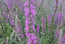 千屈菜是千屈菜科千屈菜属的多年生草本植物;根茎粗壮;叶披针形或宽披针形,无柄;花序簇生,呈聚伞状,花梗及花序梗甚短,花枝似一大型穗状花序,红紫色或淡紫色,苞片宽披针形或三角状卵形;果实为蒴果,扁圆形。…全部>>