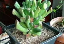 筒叶花月,是景天科青锁龙属的多年生草本植物。植株多分株,灌木状,茎较粗壮,圆柱形,表皮灰褐色;叶片肉质,互生,呈圆筒状,簇生于茎或分枝顶端,叶端呈斜截形,截面为椭圆形;花呈星状,淡白色;花期秋季。…全部>>