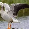 斑头雁是雁形目鸭科雁属鸟类,又称白头雁、黑纹头雁。通体大都灰褐色,头和颈侧白色,头顶有两道黑色带斑;虹膜暗棕色,嘴橙黄色,嘴甲黑色,脚和趾橙黄色;背部淡灰褐色,羽端缀有棕色,形成鳞状斑;颏、喉污白色,…全部>>