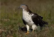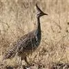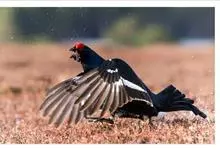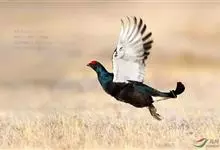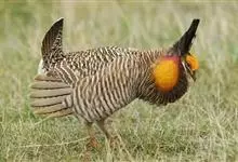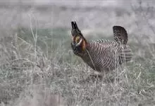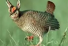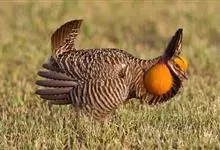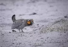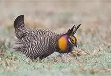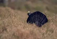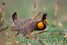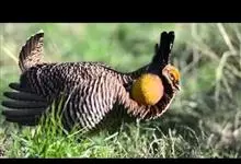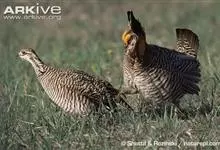 草原松鸡:体长43-47厘米,翼展69厘米,体重900-1100克。雄鸟头顶耸立的针状羽毛形成的两个尖顶羽冠。颈部和眼睛上方有黄橙色的膨胀的大气囊。雌鸟的上体是锈褐色,夹杂着黑色及皮黄色的的横斑,…全部>>