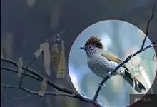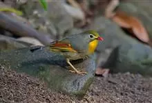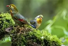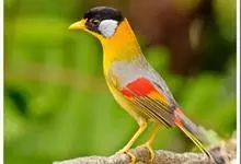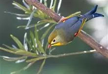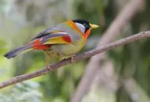银耳相思鸟小型鸟类,体长14~18厘米。头顶黑色,耳羽银灰色,前额橙黄色;外侧飞羽橙黄色,基部朱红色,极为鲜艳、醒目。尾圆形,尾上、尾下覆羽朱红色,尾暗灰褐色,外侧尾羽橙黄色,其余上体橄榄绿或橄榄黄色。…全部>>