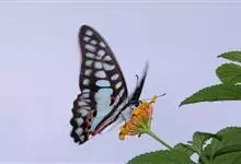 青带凤蝶Graphium sarpedon ,又名青凤蝶,是最普遍的中型凤蝶,飞行速度很快。青带凤蝶的翅膀中央有许多浅蓝色的斑点,很整齐地排列成一条直线。这些斑点由上而下逐渐变大,就像一条青色的带子。全部>>