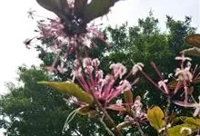 烟火树 Merr.)是唇形科、大青属常绿灌木或小乔木,株高可达4米。幼枝方形,墨绿色。叶对生,长椭圆形或披针形,先端尖,全缘或波状缘。纸质,叶背暗紫红色。聚伞状圆锥花序,顶生,小花多数,聚生成团,…全部>>